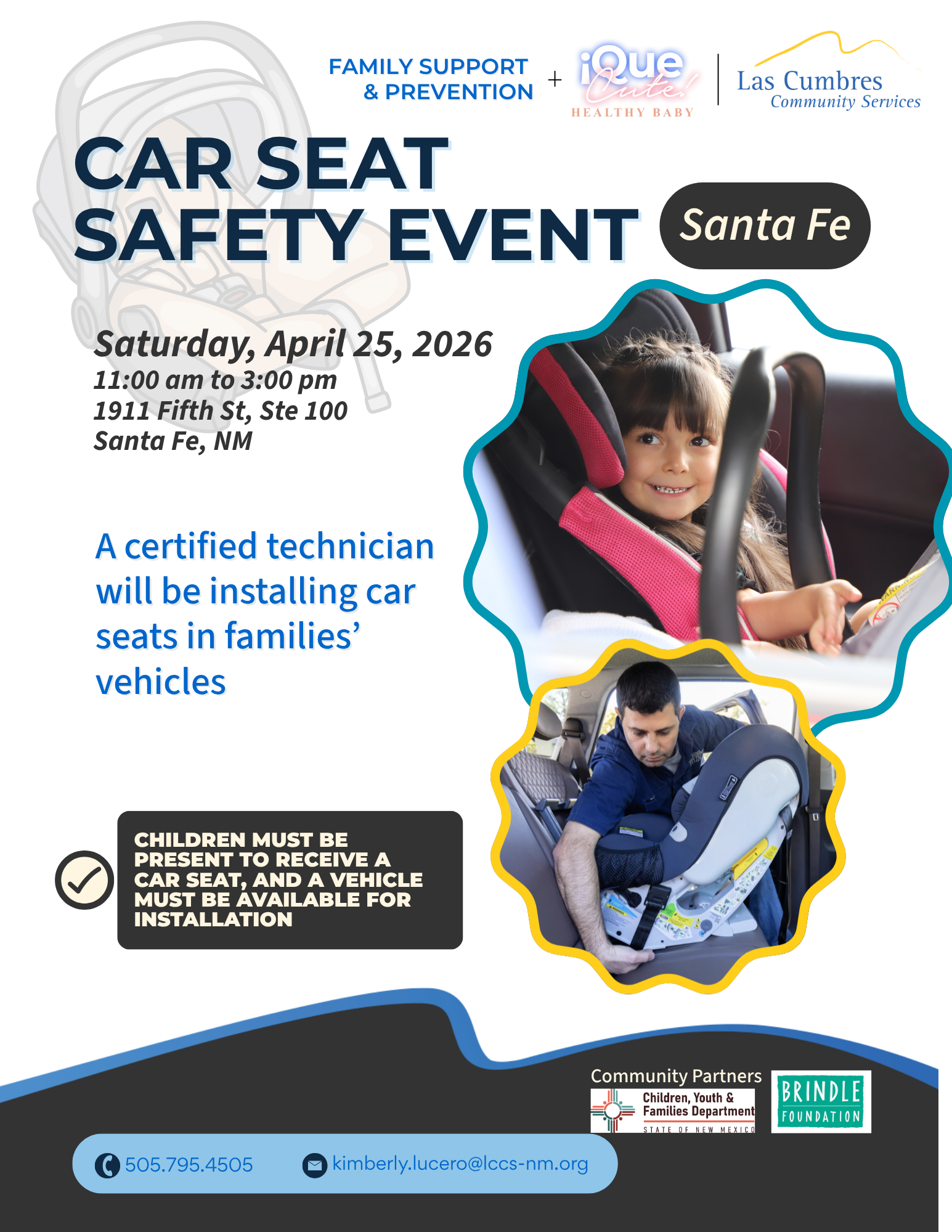 Back to All Events Car Seat Safety Event - Santa Fe Saturday, April 25, 2026 11:00 AM 3:00 PM Las Cumbres - Santa Fe Center 1911 5th Street, Suite 100 Santa Fe, NM, 87505 United States (map) Google Calendar ICS Email or Call/Text